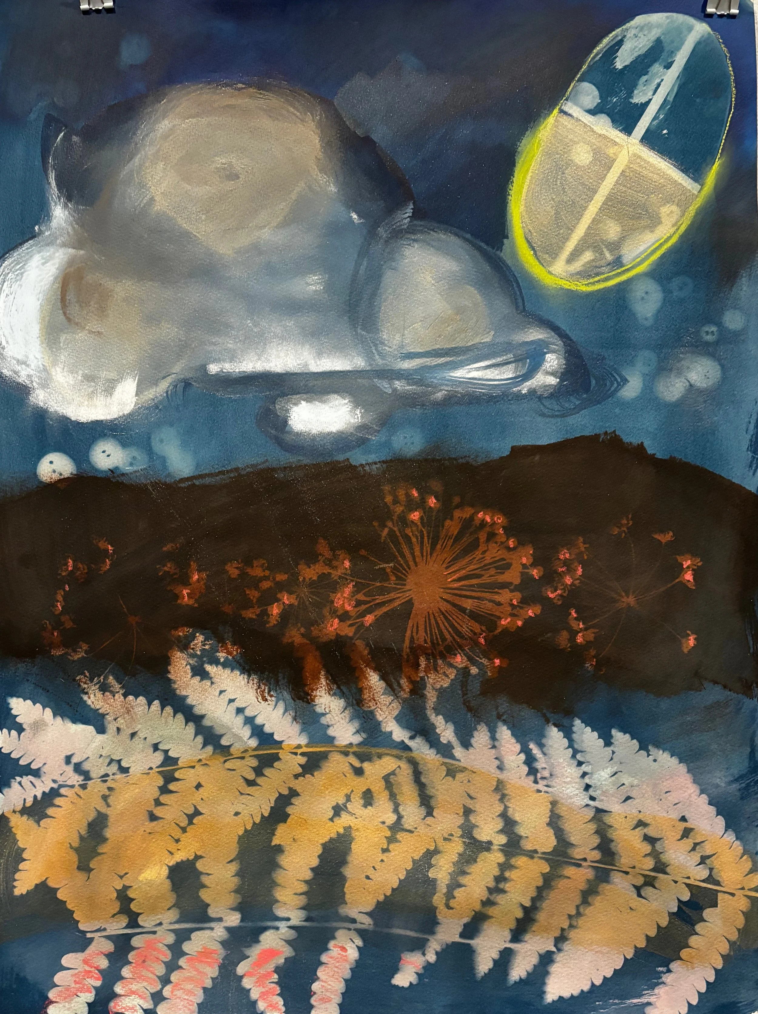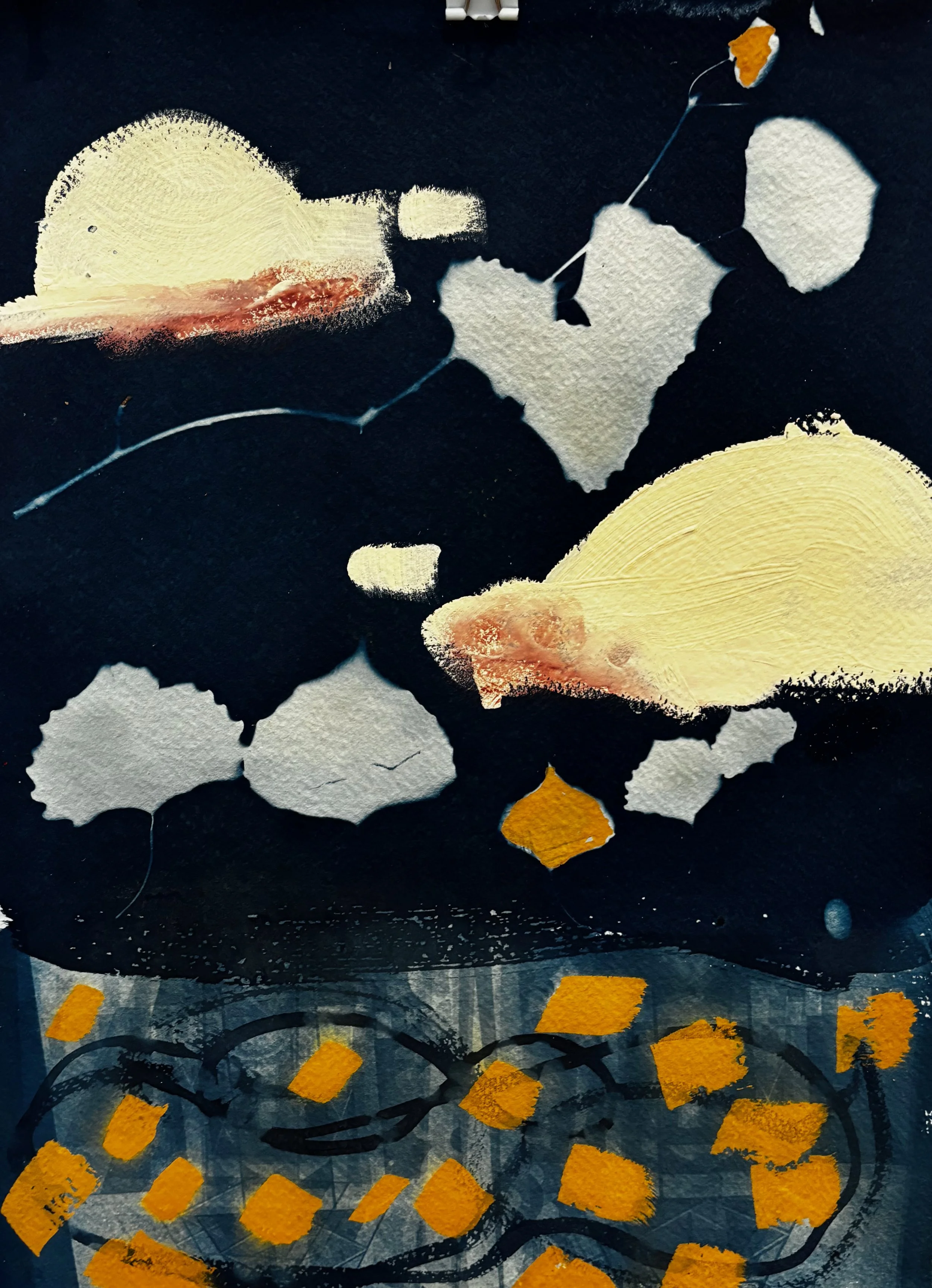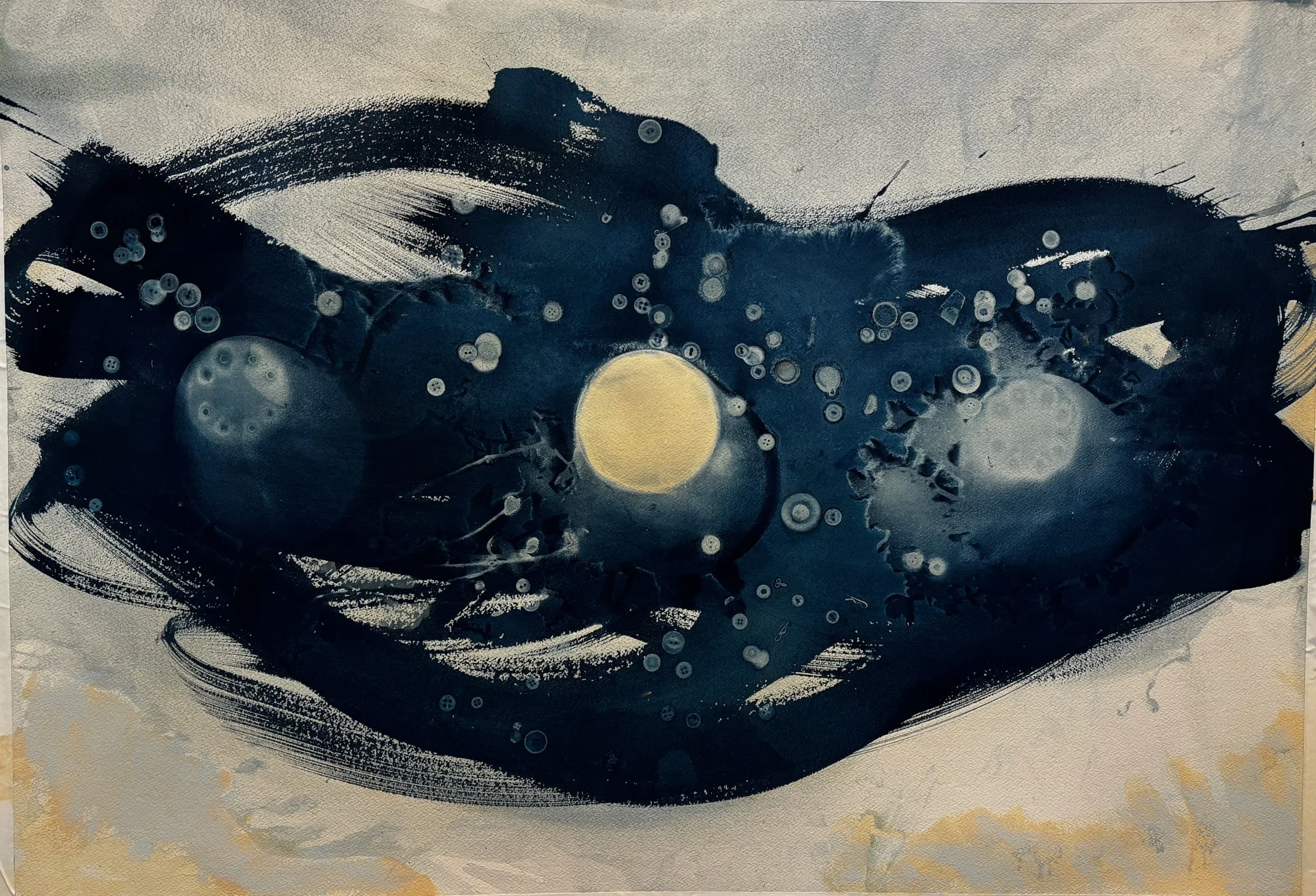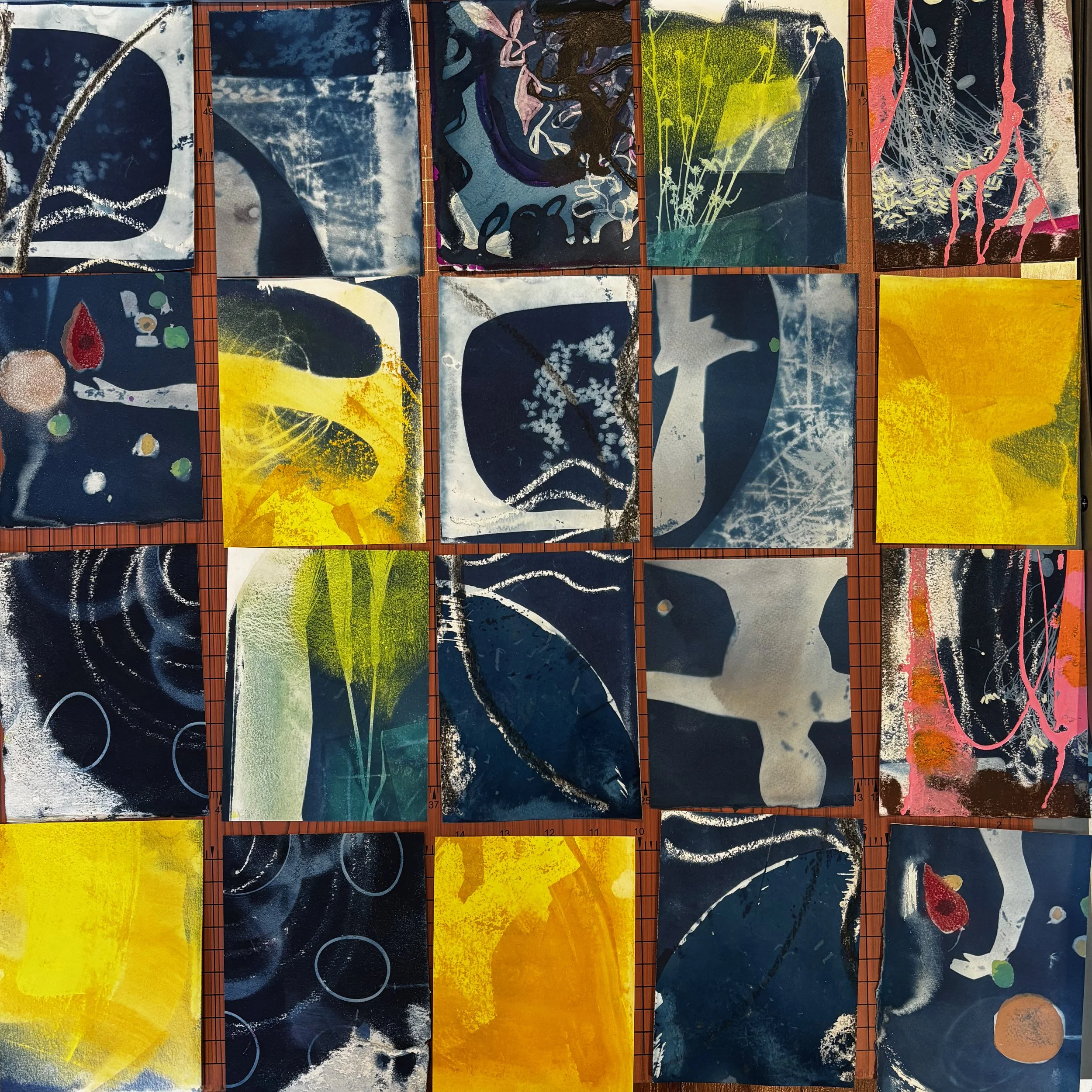 My experiments with cyanotype continue, this time merging lake and sky images with botanical printing from cyanotype.